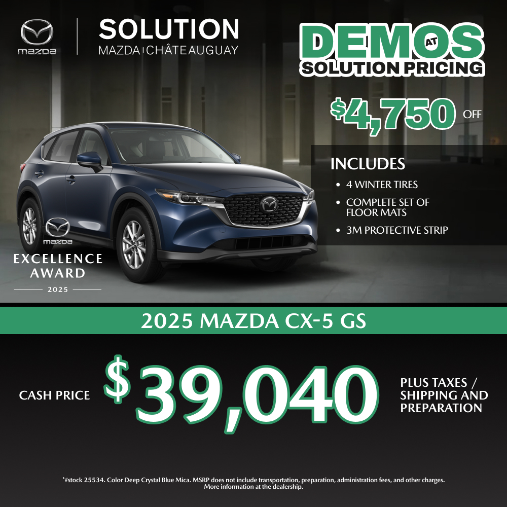 Choosing the 2026 Mazda CX-5 at Solution Mazda means benefiting from professional and personalized service. Located on Montreal’s South Shore, our dealership serves Longueuil, Brossard, Saint-Hubert, Boucherville, Saint-Lambert and surrounding municipalities.