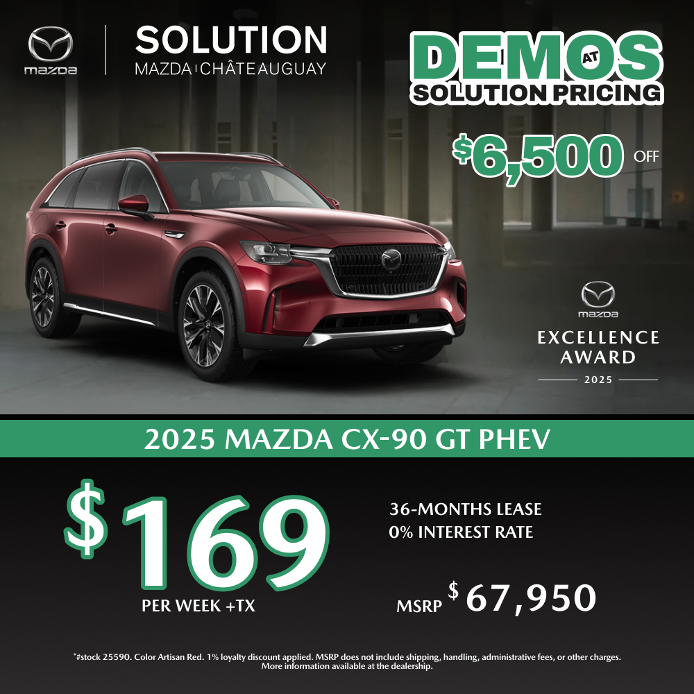This 2025 MAZDA CX-90 PHEV GT is available at Solution Mazda in Châteauguay. Contact our sales team or come meet us at 191 Bd Saint-Jean-Baptiste for more details, for a test drive, or to make a reservation.
