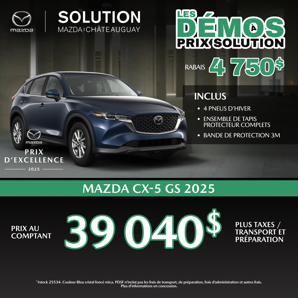 Chez Solution Mazda, nous croyons que le bon véhicule est celui qui vous accompagne au quotidien avec fiabilité, confort et plaisir. C’est pourquoi nous vous invitons à parcourir notre inventaire de Mazda CX‑5 neufs pour découvrir les modèles actuellement disponibles. Si vous avez des questions, notre équipe est à votre disposition pour discuter de vos besoins ou planifier un essai routier personnalisé. Vous pouvez également nous contacter en ligne ou visiter notre page de financement pour évaluer vos options budgétaires en toute simplicité.
