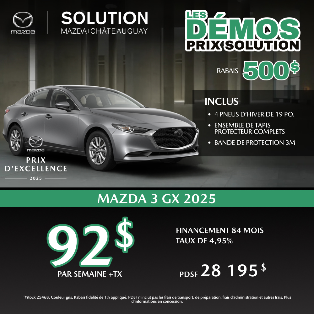 Opter pour une Mazda3 2026 chez Solution Mazda, c’est bénéficier de l’expertise d’un concessionnaire établi sur la Rive-Sud depuis plus de dix ans. Nous mettons un point d’honneur à offrir une expérience d’achat transparente, basée sur la confiance et l’écoute des besoins réels de nos clients. Notre inventaire comprend différentes versions de la Mazda3, permettant à chacun de trouver le modèle qui correspond à son budget et à ses attentes.